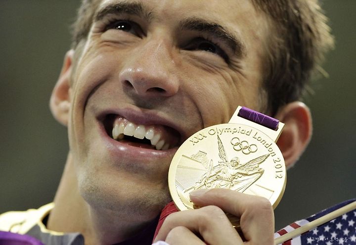 United States' Michael Phelps poses with his gold medal for the men's 4x200-meter freestyle relay swimming final at the Aquatics Center in the Olympic Park during the 2012 Summer Olympics in London, on July 31, 2012. Over the course of this year's Olympics, Phelps won 4 gold and 2 silver medals, and became the most decorated Olympian of all time, with a career total of 22 medals.