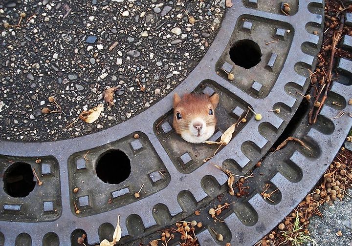 A squirrel, trapped in a manhole cover in Isenhagen, Germany, on August 5, 2012. After they were called by neighbors, police managed to free the animal by using olive oil.