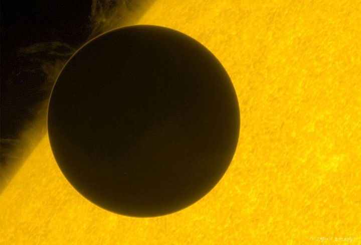 Venus moves across the Sun in this image captured by Japan's satellite Hinode, on June 6, 2012. On that day, Venus passed directly between the sun and Earth, a transit that won't occur again until 2117.