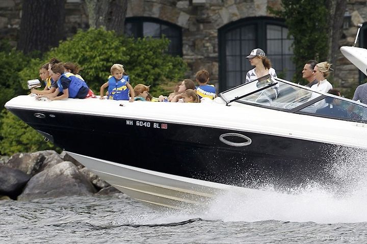 During a break from the campaign, Republican presidential candidate Mitt Romney, at right next to his wife Ann, drives his boat out of his vacation home with his grandchildren seated on the bow on Lake Winnipesaukee in Wolfeboro, New Hampshire, on July 5, 2012.