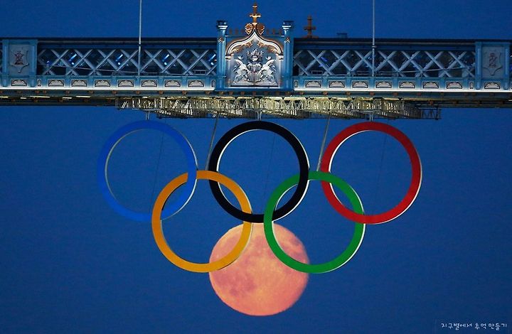 The full moon rises through the Olympic Rings hanging beneath Tower Bridge during the London 2012 Olympic Games, on August 3, 2012.