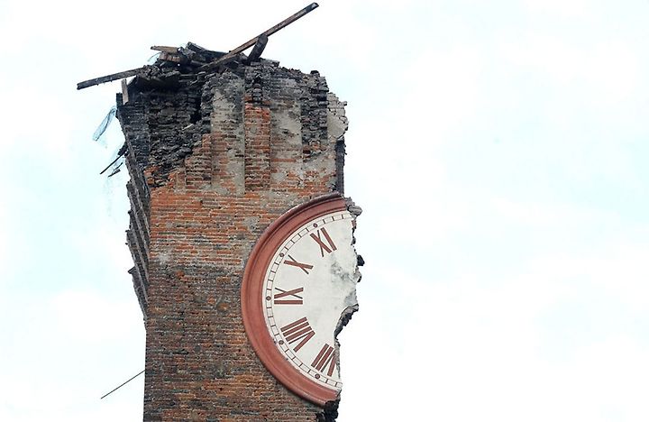 Half of a clock face on Modenesi's Towers of Finale Emilia, destroyed following a Magnitude 6.0 earthquake on May 20, 2012 in Ferrara, Italy.