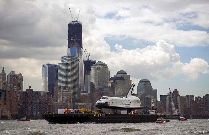 The space shuttle Enterprise is towed past the World Trade Center's Freedom Tower, on its way to permanent display at the Intrepid Sea, Air & Space Museum, on June 6, 2012.