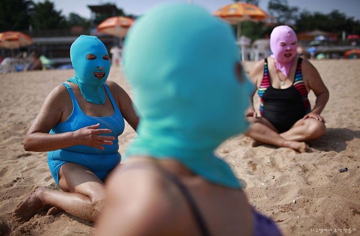 Women, wearing nylon masks, rest on the shore during their visit to a beach in Qingdao, Shandong province, on July 6, 2012. The masks, which were invented by a woman about seven years ago, are used to block the sun's rays. The mask is now in mass production and on sale at local swimwear stores.