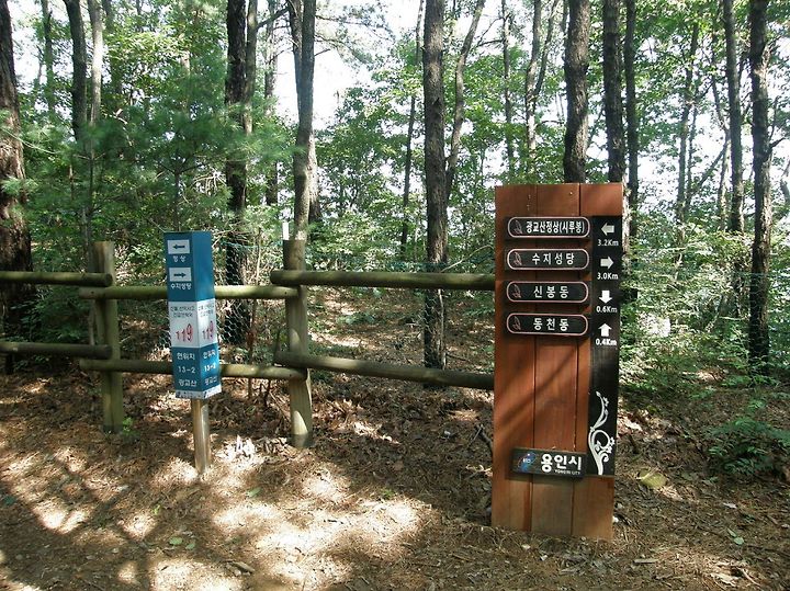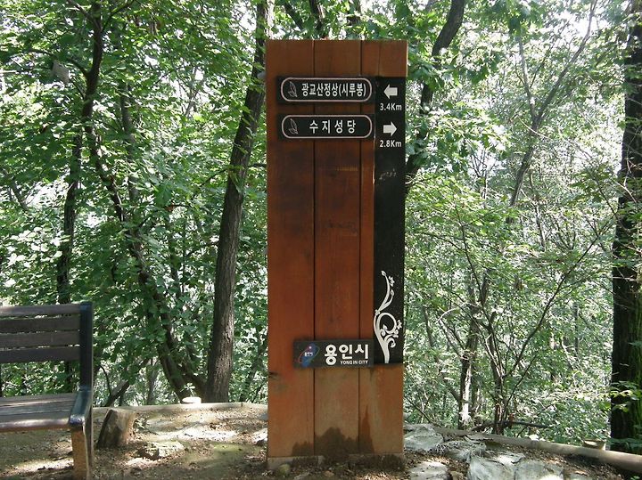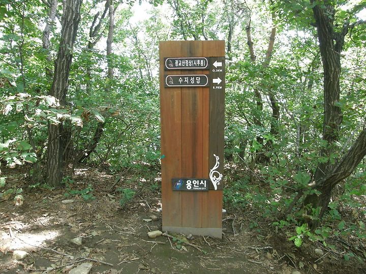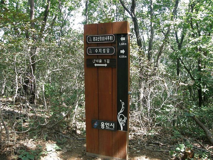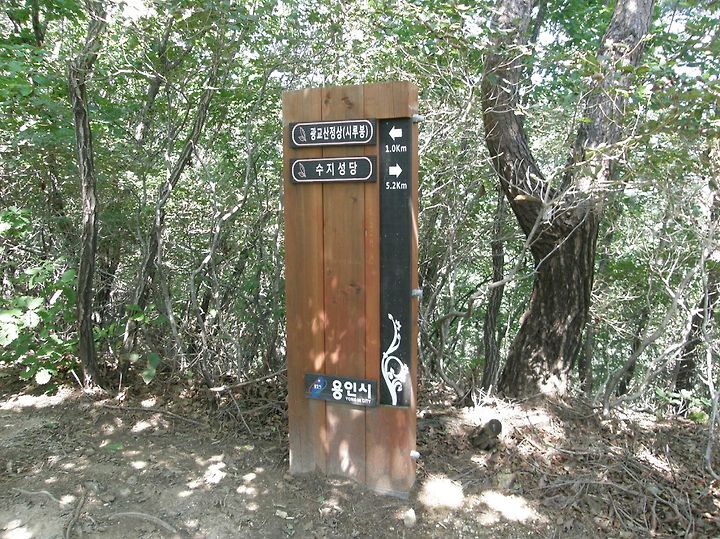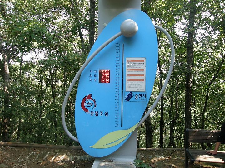 어느덧 정상이 얼마 안남았습니다. 용인시에서 만들어놓은 이정표가 시간과 현재 온도를 알려줍니다.