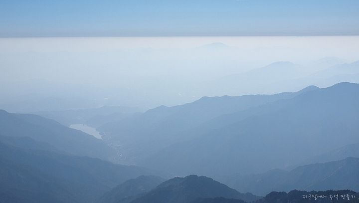 하늘아래 구름운이 가로로 드리워져 있고 그 속으로 솟아 오른 봉우리..