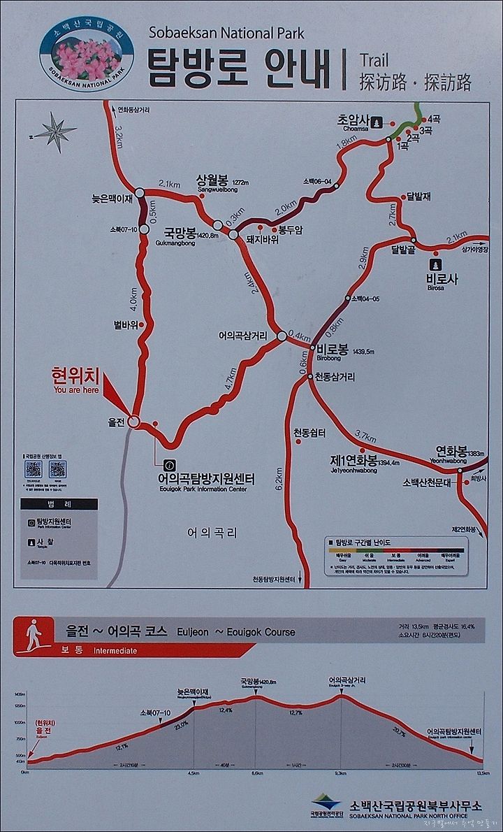 산행코스는 <어의곡탐방지원센터 - 어의곡삼거리 - 비로봉 - 어의곡 삼거리 - 국망봉 - 상월봉 - 늦은맥이재 - 을전마을 - 어의곡탐방지원센터>로서 원점회귀산행코스입니다. 소요시간은 6시간 조금 더 걸렸습니다.