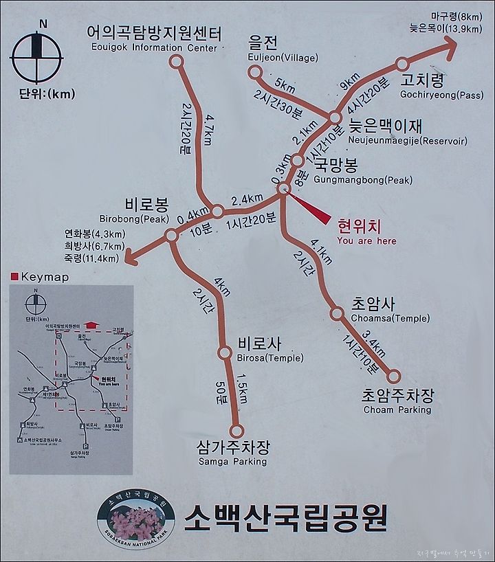 현 위치라고 되어 있는 곳은 비로봉에서 국망봉 중간쯤의 능선입니다.