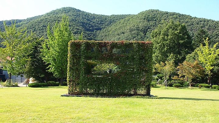 정원 앞의 잔디밭에는 와인병의 모양으로 포도넝쿨이 만들어져 있는데 이채롭습니다.