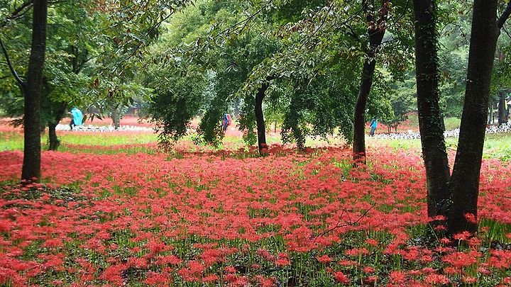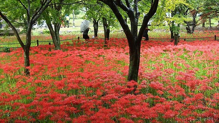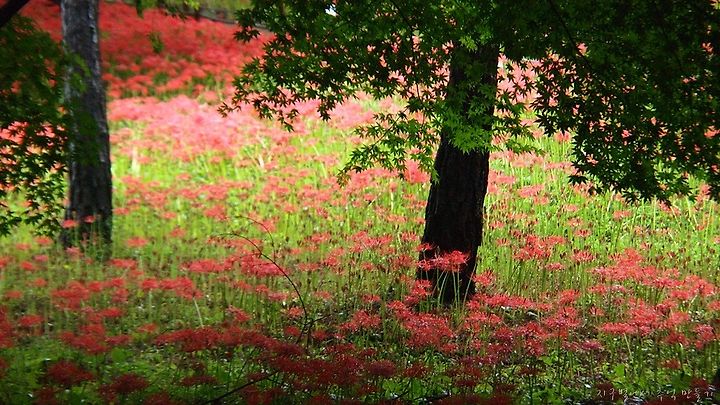 아직 단풍이 물들지 않아 초록이 가득한데 그 속에 붉게 피어있는 상사화는 그 자태가 더욱 돋보입니다.