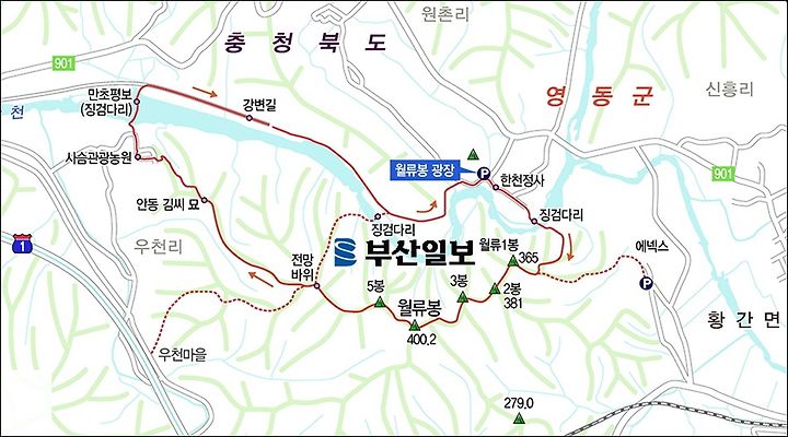 산행코스 : 월류봉광장 - 한천정사 - 징검다리 - 1봉~5봉 - 전망바위 - 하산 - 징검다리 - 월류봉광장 (원점회귀)
