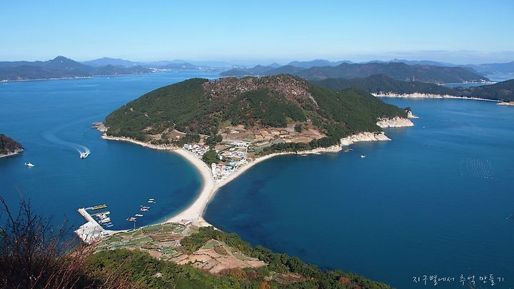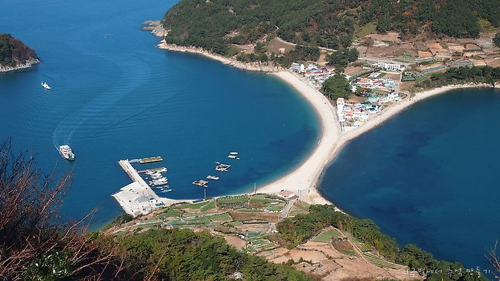 8자 모양과도 같고 모래시계처럼 생기기도 한 비진도는 윗섬과 아랫섬을 잇는 잘룩한 사주에는 한쪽은 몽돌, 한쪽은 모래로 된 멋진 해수욕장이 있기도 합니다.