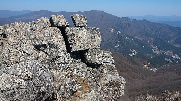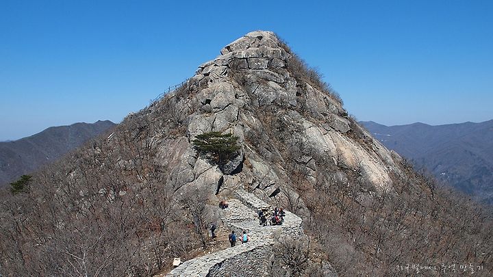 정상에는 석축으로 된 산성을 복원하여 놓았는데 너무 작품성(?) 있게 만들어 두어 산성이라기보담 돌로 만든 조형물로 보여 지는데 이마저도 입구 성벽이 와르르 무너져 있더군요.