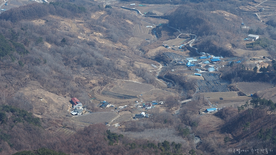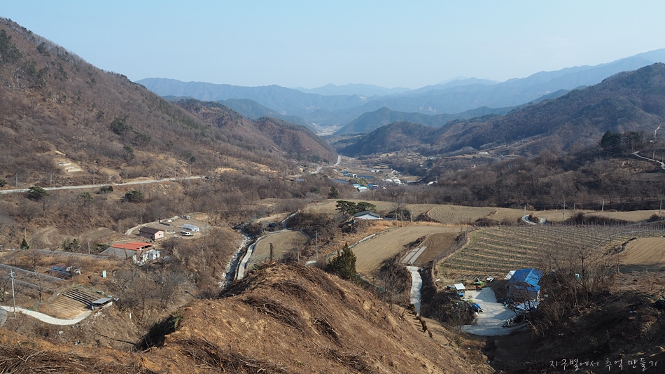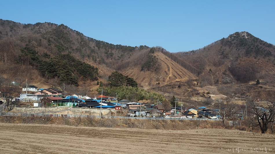 산 아래 보이는 마을이 덕산2리(온배미) 마을입니다.
