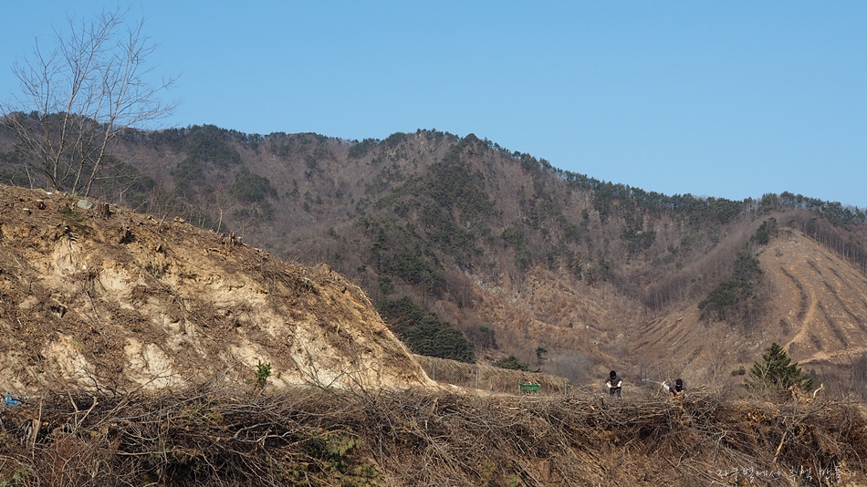 덕산마을에서올라오신 할머니 두분이 벌목 잔가지를 아궁이으로 이용하기 위하여 작운 수레에 모으고 있습니다.