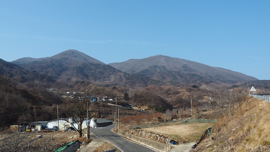 덕산면에서 덕산재로 올라가는 길에서 올려다 본 대덕산(우)과 초점산(좌)