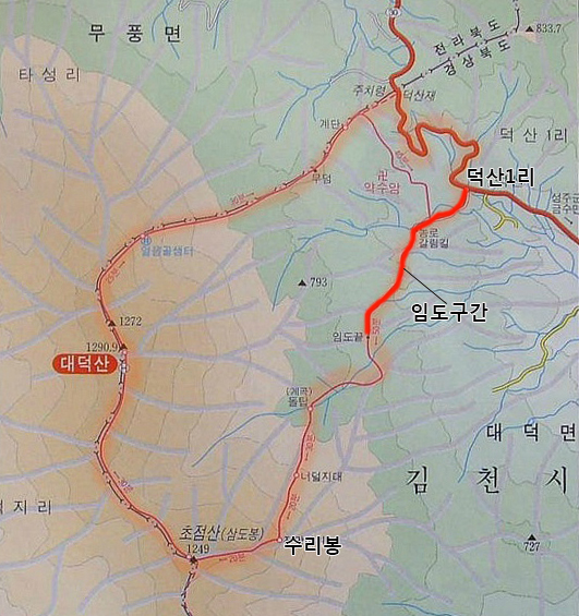 위의 주황색선이 제가 다녀 온 구간이고 들머리는 덕산재, 날머리는 덕산1리마을입니다.