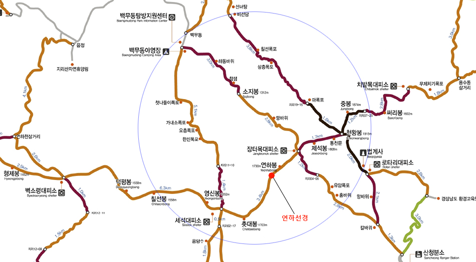 오늘의 산행거리는 대략 20km. 지도에 연하선경의 위치를 표시해 놓았습니다.