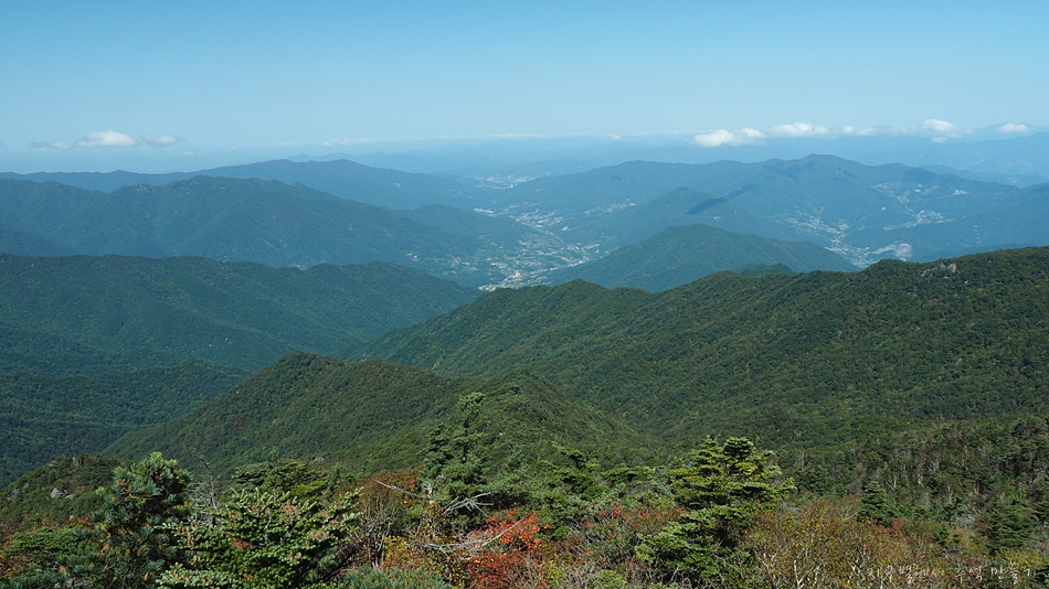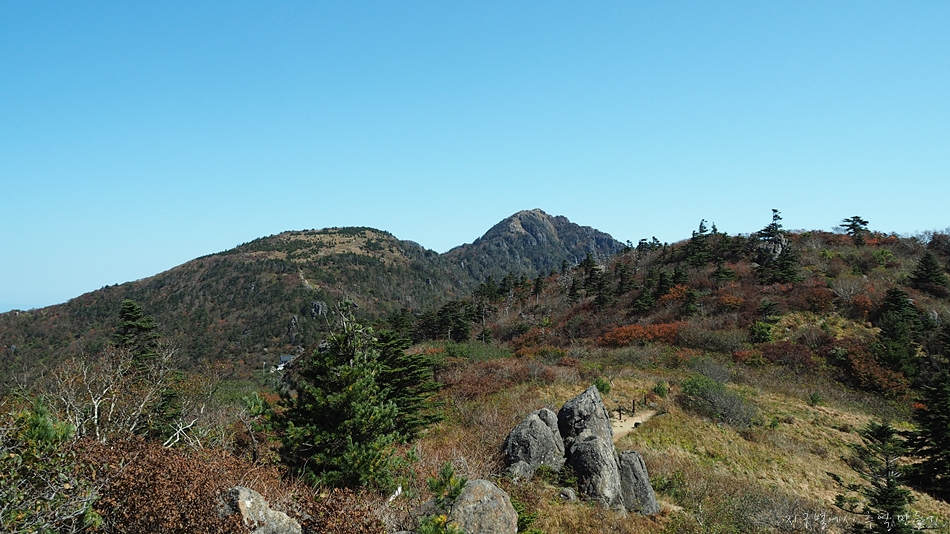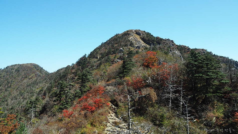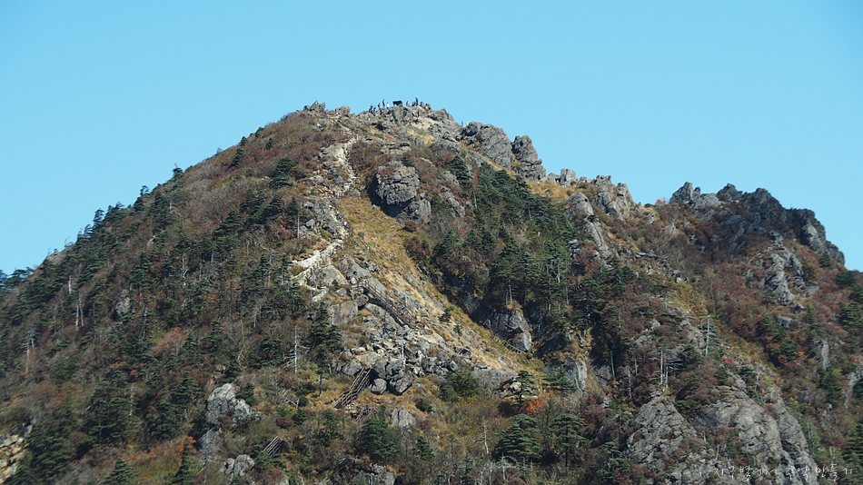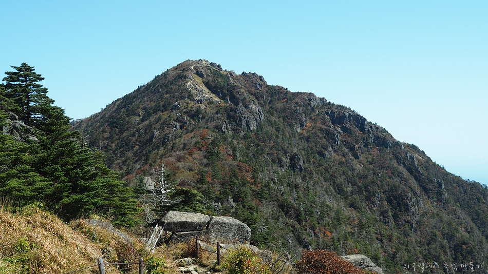 울긋불긋 가을빛이 천왕봉 허리를 감싸고 있어 아랫쪽과는 확연히 다른 분위기를 연출합니다.