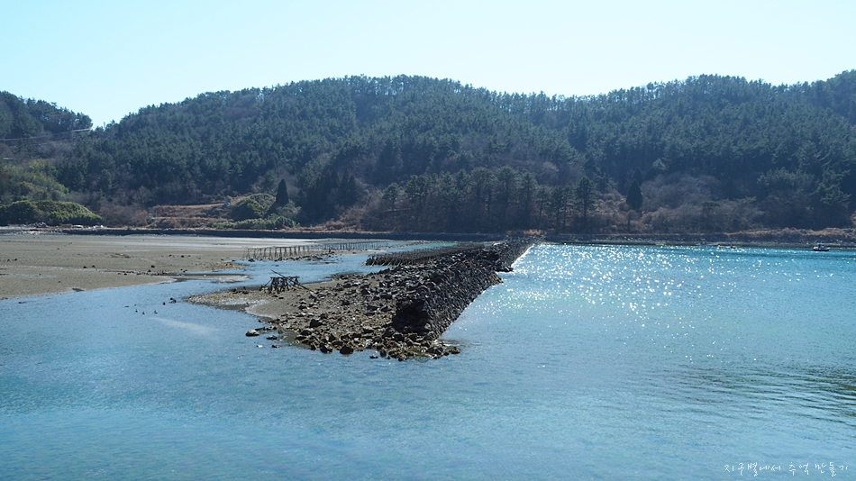 '박정희 때 이곳 바닷가를 논으로 맹글라꼬 동네 사람들이 지게 지고 돌을 날라 제방을 쌓았는데 그 해 비가 억수 내려서 산 쪽 위 논에 타작하고 쌓여 있던 보리짚들이 떠내려와 방파제 숨구멍을 막아 버리는 바람에 수압으로 제방이 다시 무너져뻐렸지.'