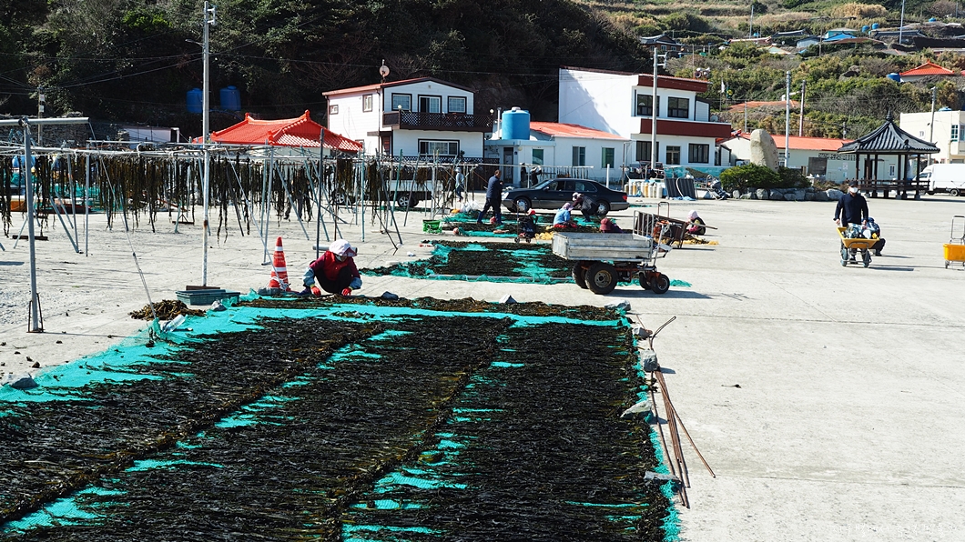 다행히 방파제가 북쪽 파도를 잘 막아주어 안쪽에는 널찍한 공터가 형성이 되어 있어 이곳에서 동네 주민들이 주 수입원인 미역을 말리고 다듬는 작업을 하고 있답니다.