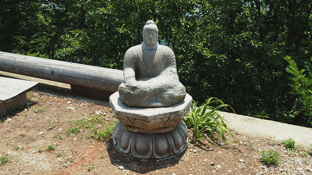 법당 앞에는 목이 날아 간 부처님이 있는데 새로 얹어서 땜빵을 한 머리가 너무 작아 아주 이상하게 보이는 돌부처가 되었습니다.