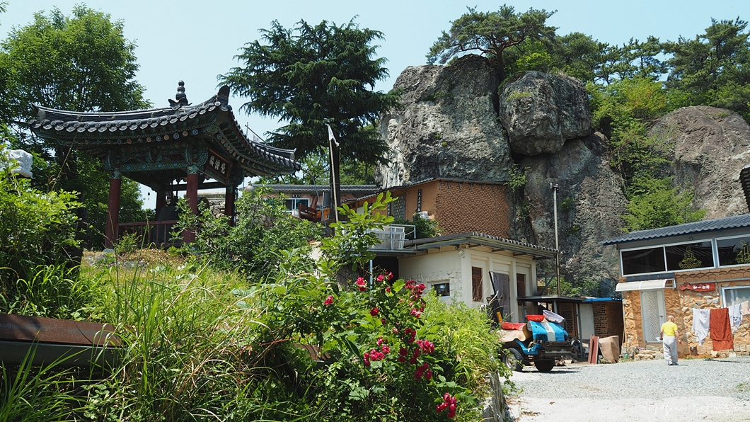바위 밑에 법당이 마련되어 있고 법당 위 커다란 바위에는 약병을 들고 있는 관세음보살이 새겨져 있는데 입체감은 훌륭하나 균형이 맞지 않아 보기에 어색한 느낌입니다.