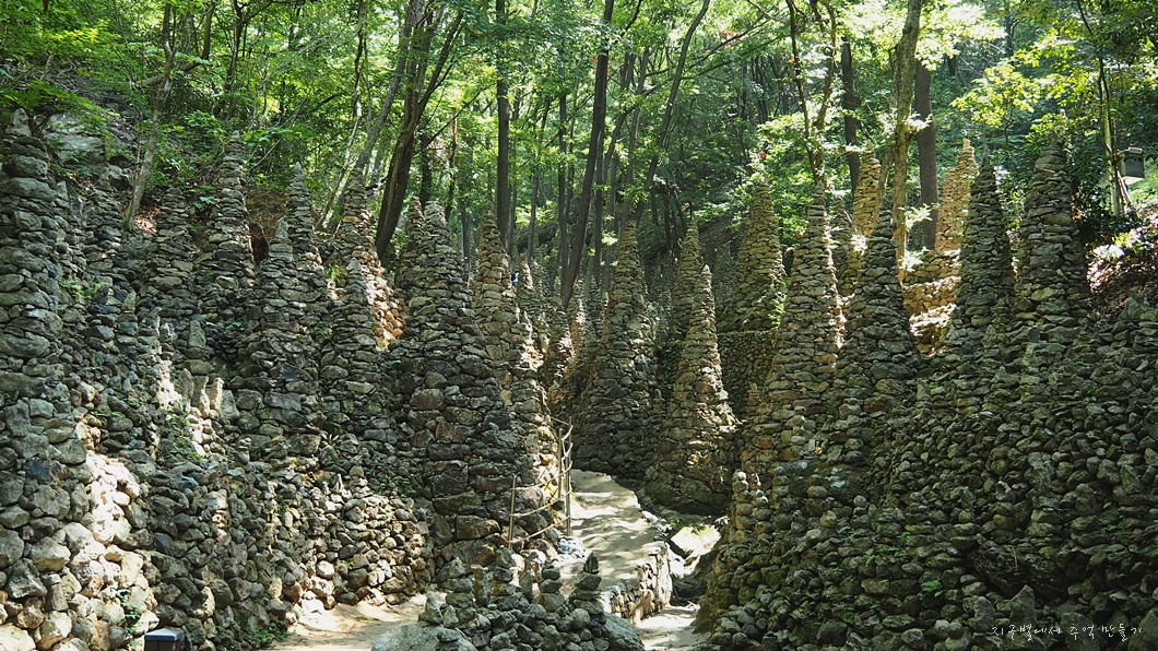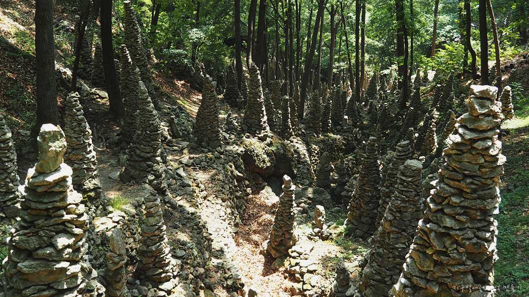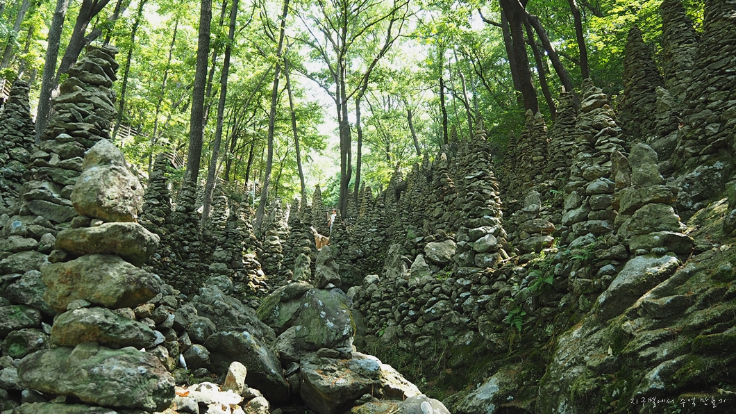 계곡을 따라 양 옆으로 크고 작은 돌탑들이 빽빽이 세워져 있습니다.