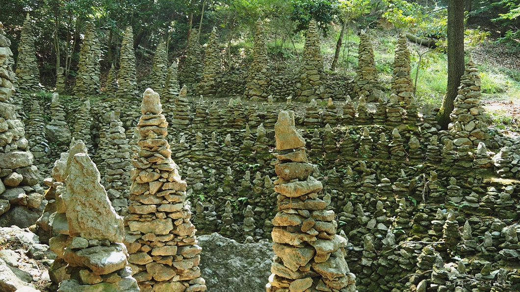 산자락 양덕동에 사는 이삼용이란 분이 93년 3월부터 쌓았다고 하는데 현재 돌탑 숫자가 무려 1,000기.