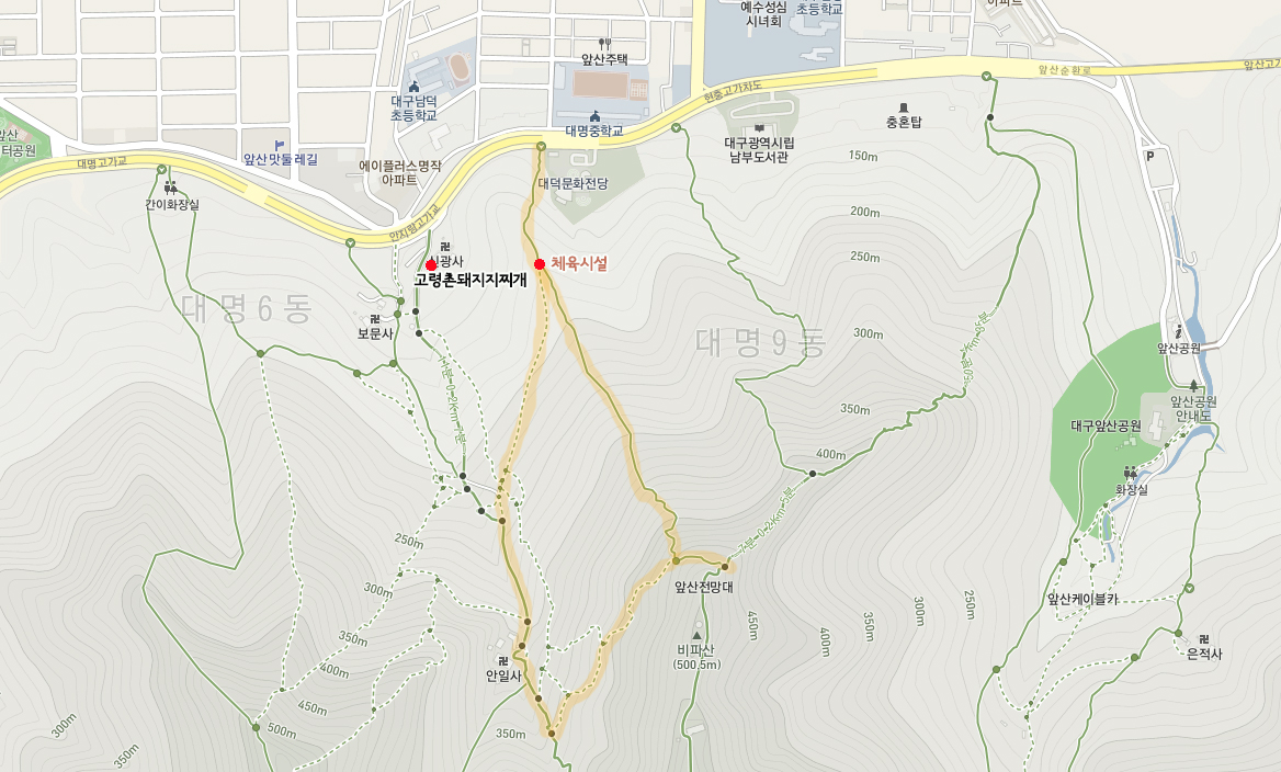 대개 앞산 전망대는 위 지도에서 고령촌돼지찌개라고 표시되어 있는 곳이 안일사 입구이자 안지랑관리사무소가 있는 곳인데 이곳에 주차를 하고 안일사를 거쳐 오르면 됩니다. 이 구간으로 오르면 1시간 20여분 정도 소요 됩니다.