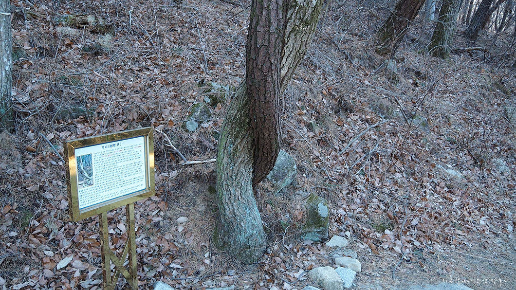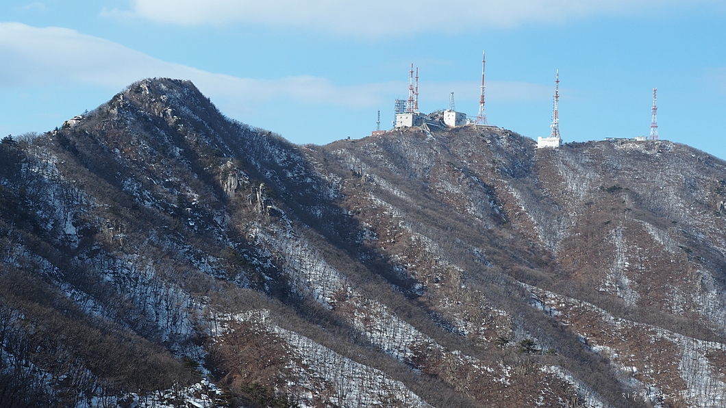 가장 높은 능선길로 등산로가 조성된 것이 아니고 북쪽 10여 m 아래 사면으로 등산로가 되어 있어 겨울에는 미끄러운 눈길입니다.