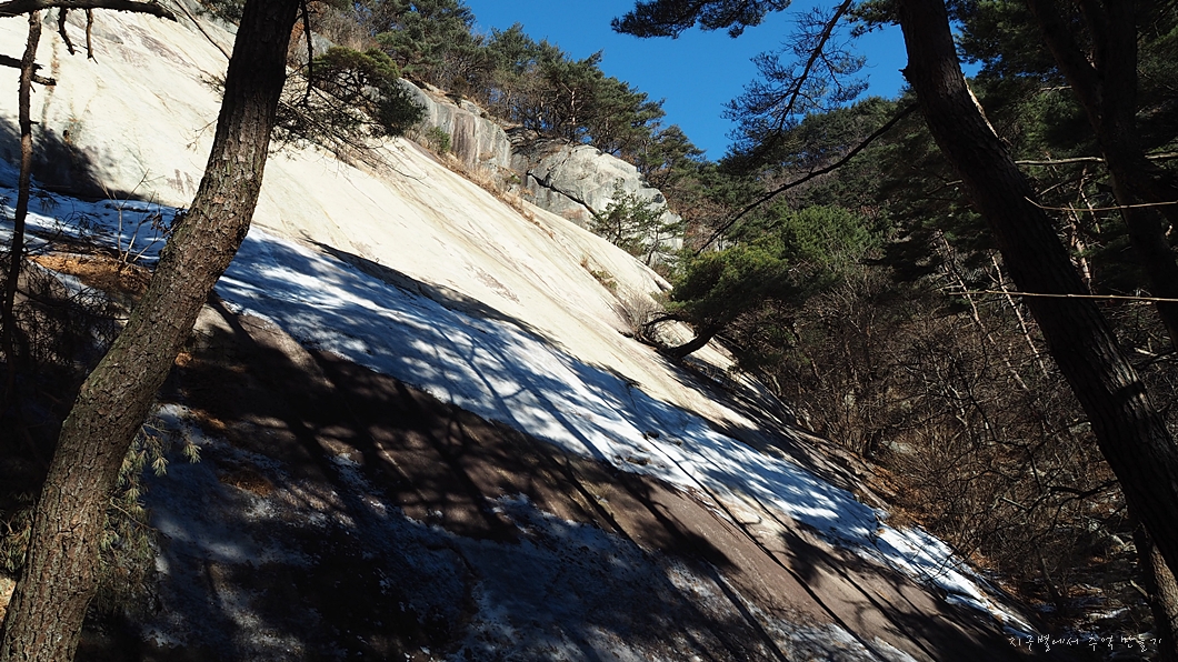 팔공산 주능선길이 북쪽으로 약간 사면길로 된 곳이 많고 그늘이라 거의 눈길에 급경사와 절벽이 많이 걷는데 조심해야 합니다.