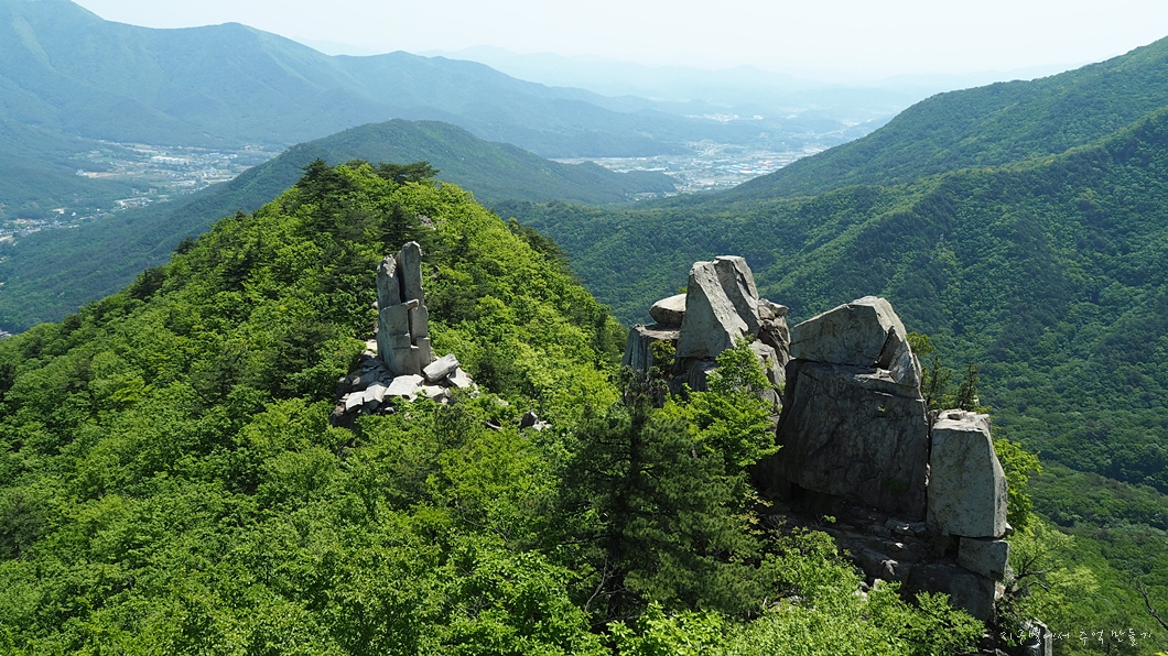 뒤편으로 가지산 상운산 고헌산이 병풍처럼 펼쳐지고 우뚝 솟은 입석대는 초록맞이 5월의 기운을 하늘로 솟아 올립니다.