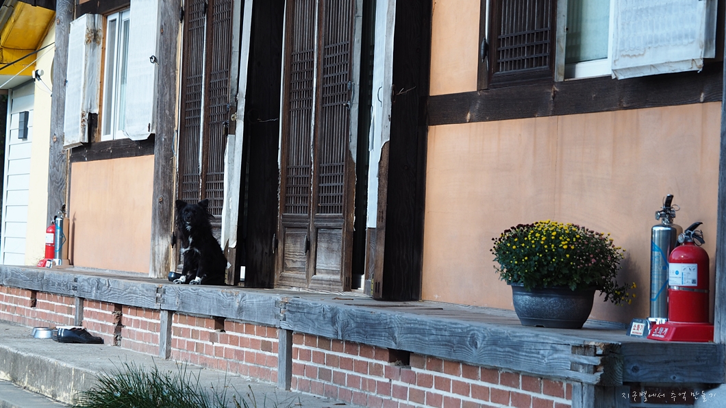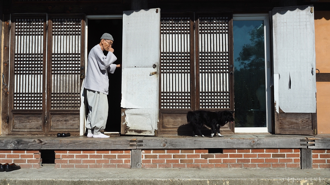 주지스님이 나와서 한마디 꾸짖으니 그때서야 짖는 걸 멈추네요.