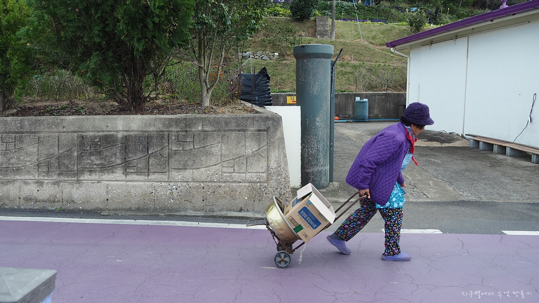 보라색 상의와 모자, 보라색 신발을 신고 구루마를 끌고 가는 할무니.