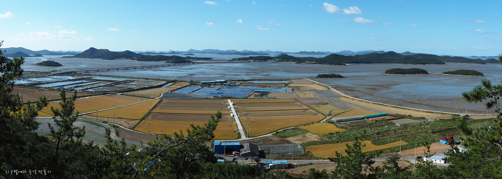 절에서 내려오는 길에서 조망되는 추포도와 염전, 그리고 벼가 익어가는 들판 풍경.