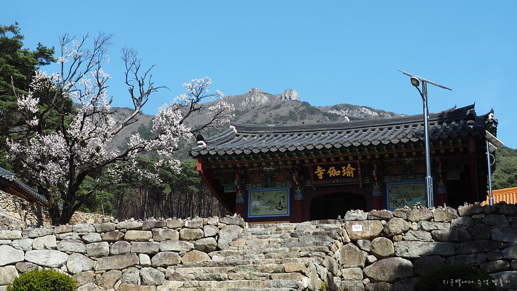 벚꽃과 유가사 현판 뒤로 천왕봉이 올려다 보입니다.