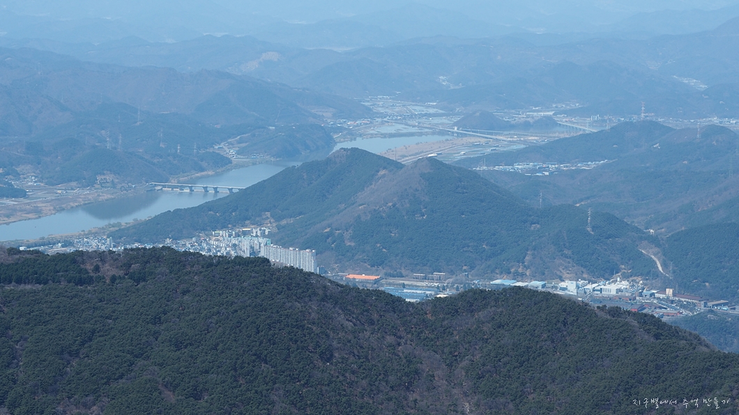멀리 경남 서부 지역의 산들과 대구 달서구 쪽 조망의 파노라마.