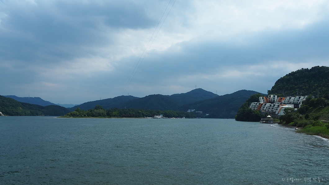앞쪽에 보이는 섬이 남이섬.