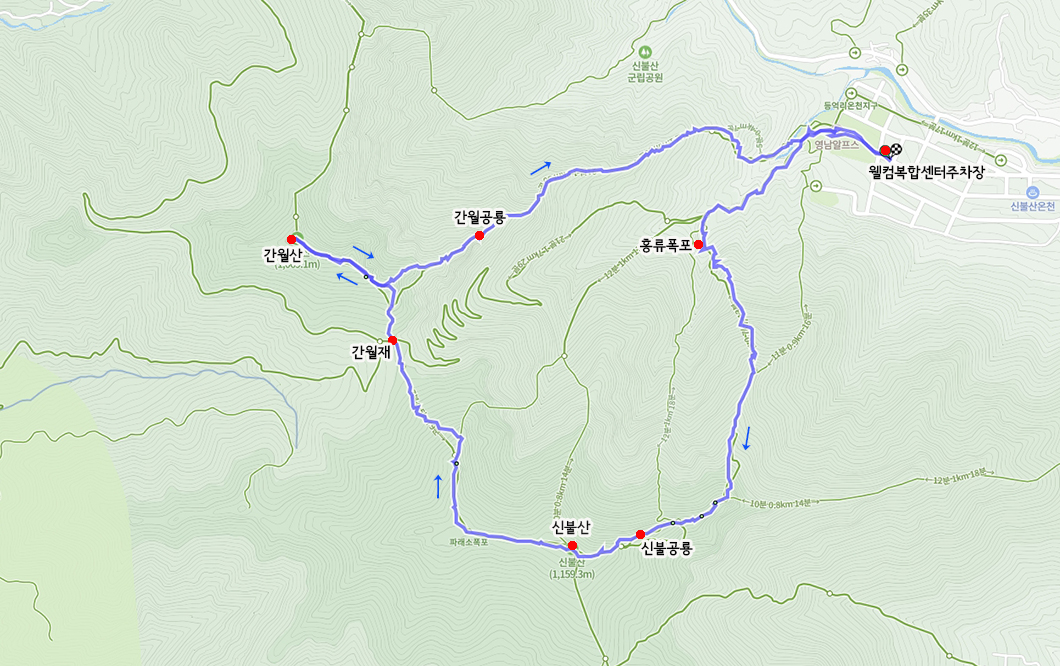 산행 코스 : 영남알프스복합웰컴센터 주차장 - 홍류폭포 - 신불공룡 - 신불산 - 간월재 - 간월산 - 간월공룡 - 주차장(원점회귀)