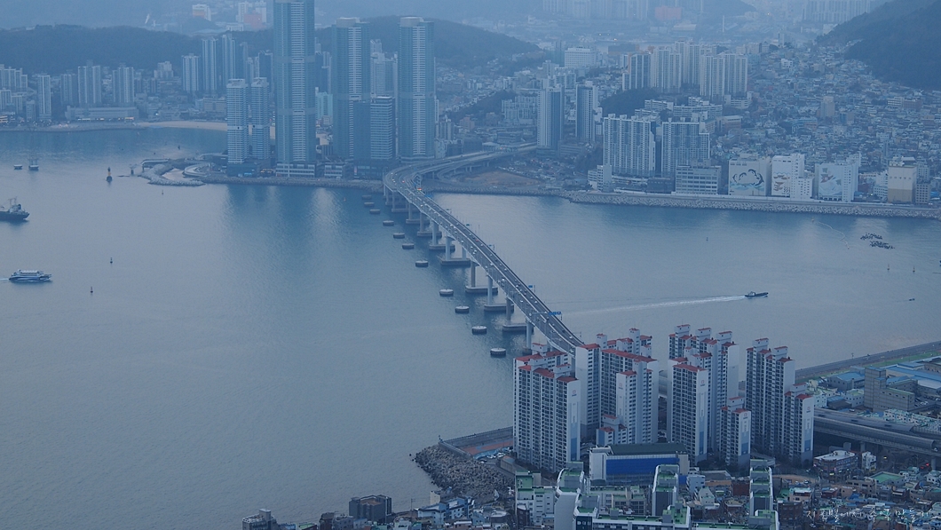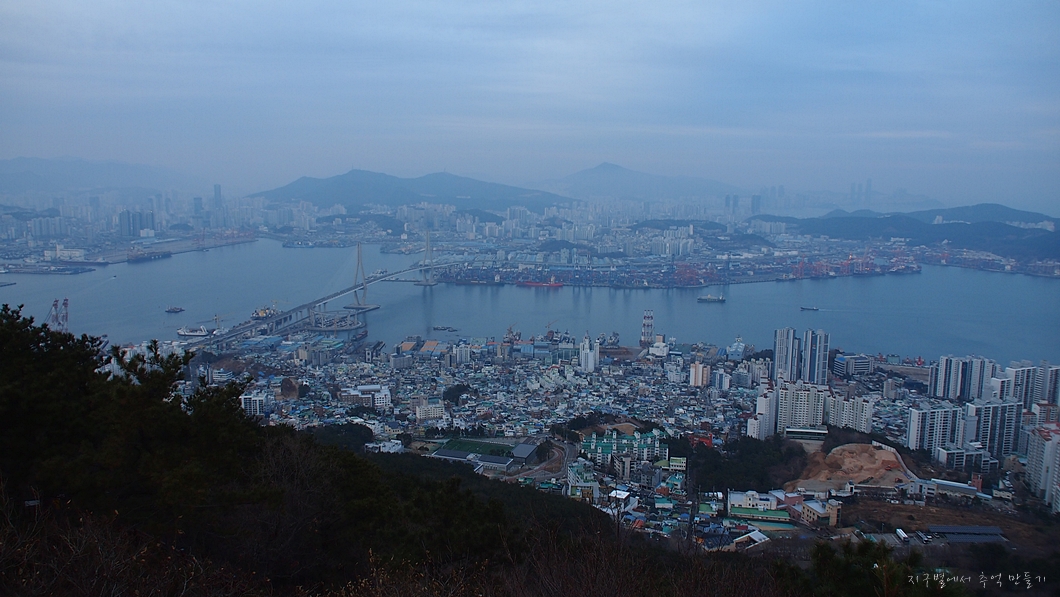 남항대교 건너 송도해수욕장이 희미하게 보이고 그 뒤로 멀리 가덕도까지는 뚜렷하게 보입니다.