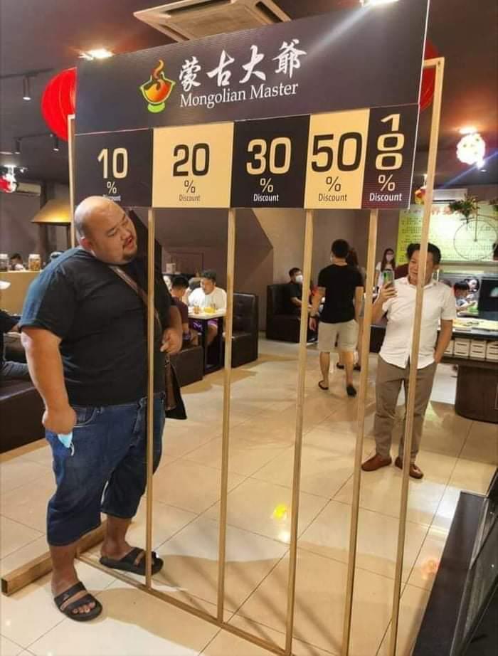 말레이시아의 이 레스토랑에서는 배 크기에 따라 식사의 할인을 제공합니다.