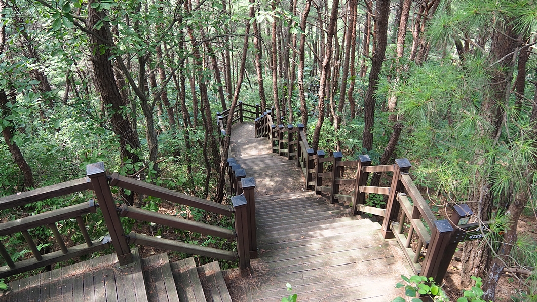 나각산에서 가장 가파른 구간인 이 계단만 오르면 출렁다리와 팔각정자인 낙강정.