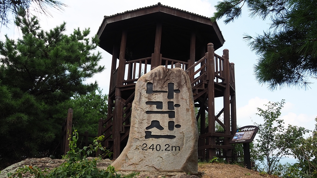 소라(螺) 뿔(角) 모양으로 생겼다고 하여 나각산(螺角山)인데 해발 240m입니다.