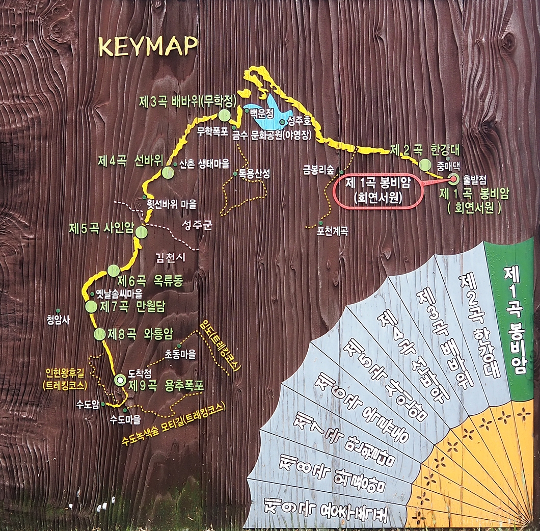 회연서원 입구에 커다란 안내판 아래쪽 한 귀퉁이에 이렇게 무흘구곡 안내도가 그려져 있는데 이걸 폰으로 사진을 찍어서 다음 코스를 이어 갔답니다.