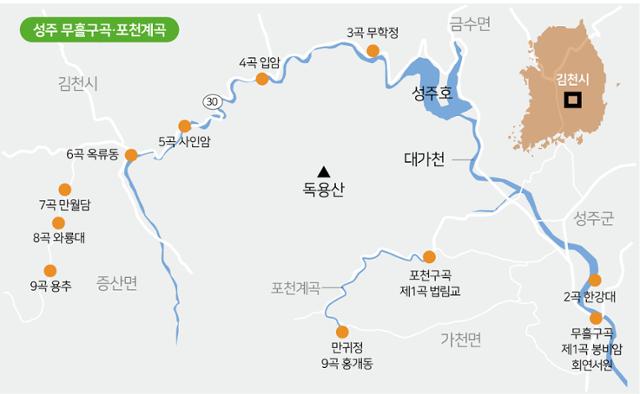 "성주군에 1~4곡이 있고, 김천시 증산면에 5~9곡이 있다. 무흘구곡의 총길이는 35.7km로 우리나라는 물론 세계에서 가장 긴 구곡이다."