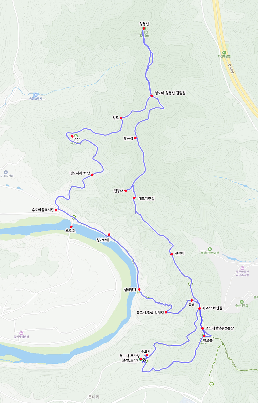 산행은 조그만 사찰인 북고사에서 시작하여 향로봉에 오르고 능선을 오르내리면서 2km 정도 이동하여 활공장에 도착, 조망을 즐긴 다음 임도를 통하여 하산하는 중간에 향로봉보다 100m 더 높은 칠봉산을 다녀와서 다시 임도로 주욱 내려가서 이름 그대로의 명산을 빙 둘러내려 가서 금강까지 하산을 하게 됩니다.