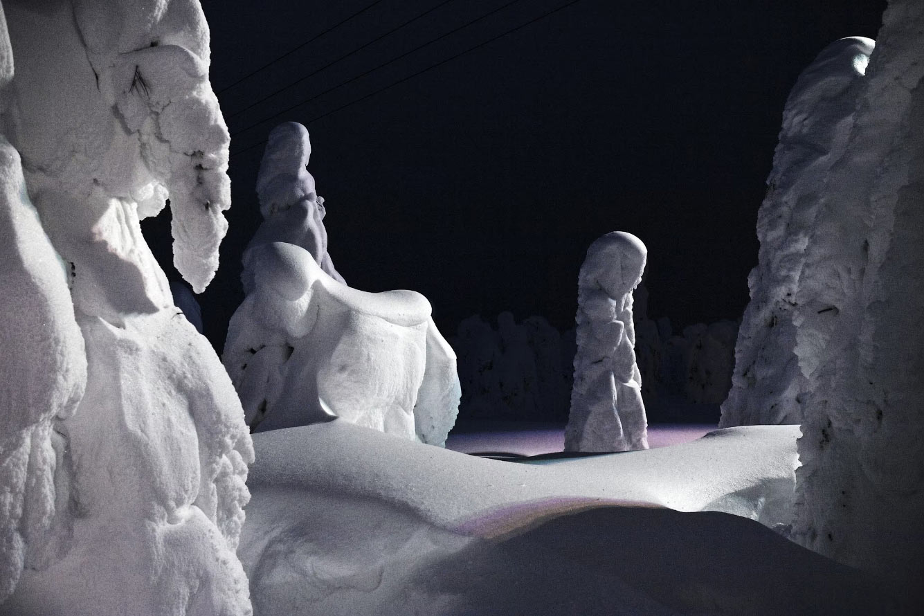 호수 위로 부는 강한 바람이 물방울을 나무와 가지에 떨어뜨려 얼게 하고 거의 수평에 가까운 고드름이 형성되는데 이 모양이 기괴하게 보여 설괴물(スノーモンスター)이라는 이름으로 불리네요.