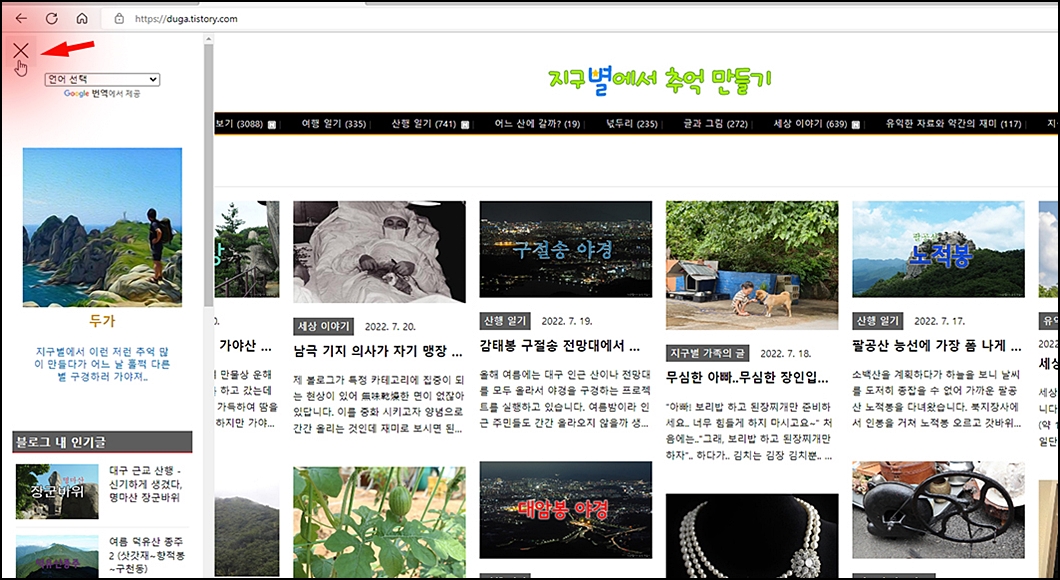 ②. 프로필이나 인기글은 좌측 상단의 삼선(三)을 클릭하면 됩니다. X를 클릭하면 닫힙니다.