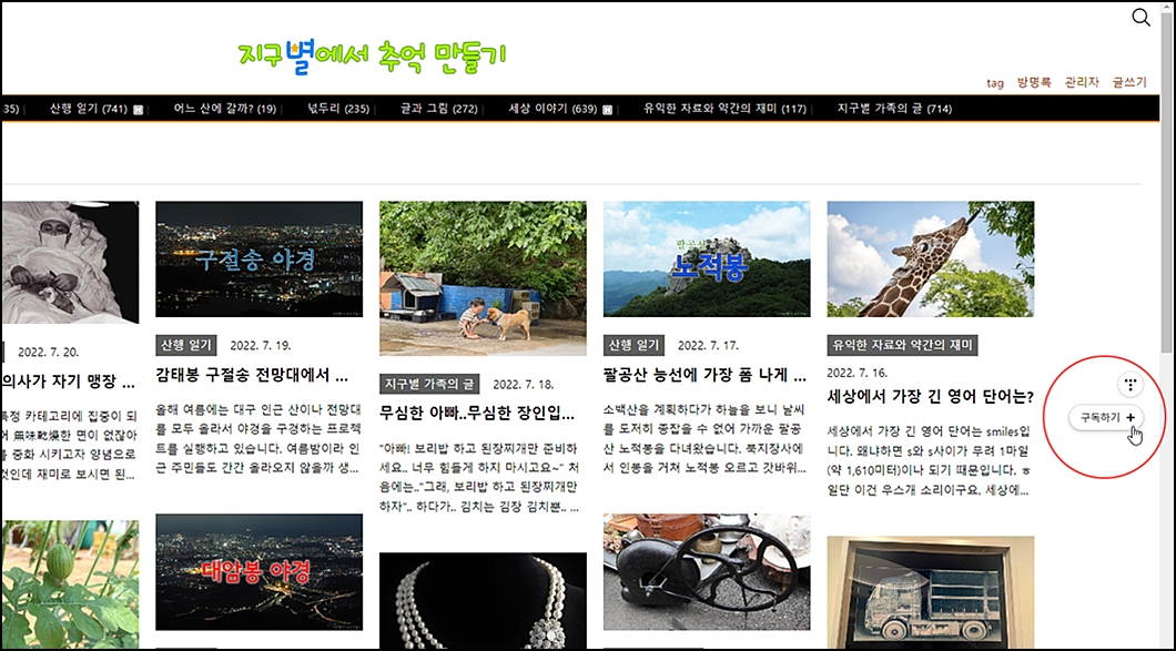 3. 지구별에서 추억 만들기 블로그에서는 관리자 외 팀 블로그로 운영이 되고 있어 몇 분의 가족(블친)분들이 같이 글을 올려 꾸미고 있습니다. (지구별 가족의 글 보기 - 이곳)
